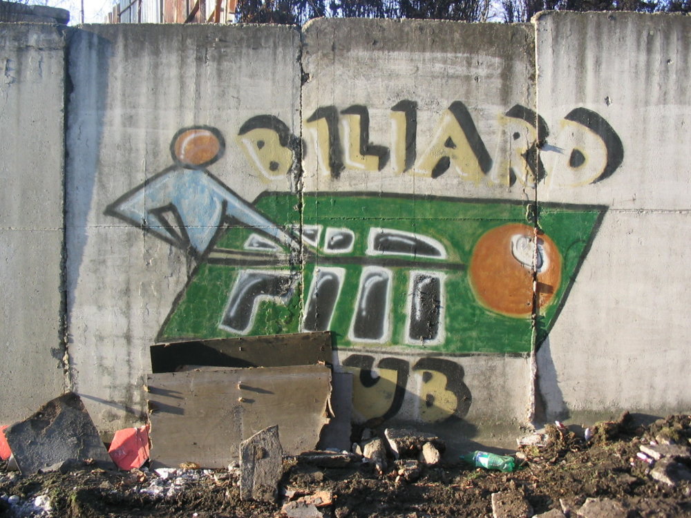 Reklamná nástenná maľba sprejom pre už neexistujúci biliard club Fino v Námestove, 1998.